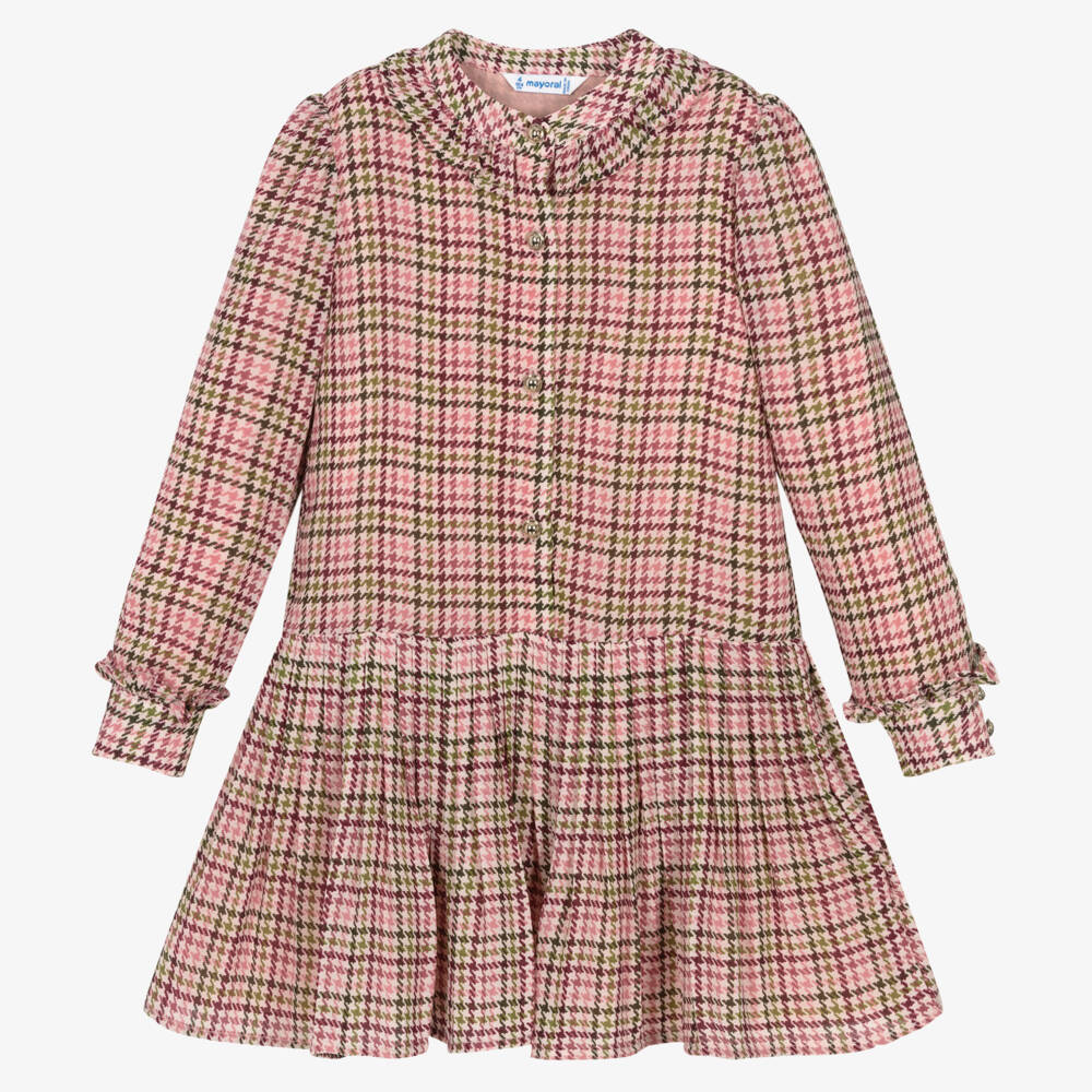 A pink and green dress for girls from Mayoral, with a smart houndstooth print. It is made in soft and lightweight crêpe chiffon, with sweet ruffle trims and gold-tone statement button fastenings on the bodice and cuffs. This elegant dress has a dropped waist and a pleated skirt for a stylish silhouette. It is fully lined with lightweight jersey for comfort and modesty.
