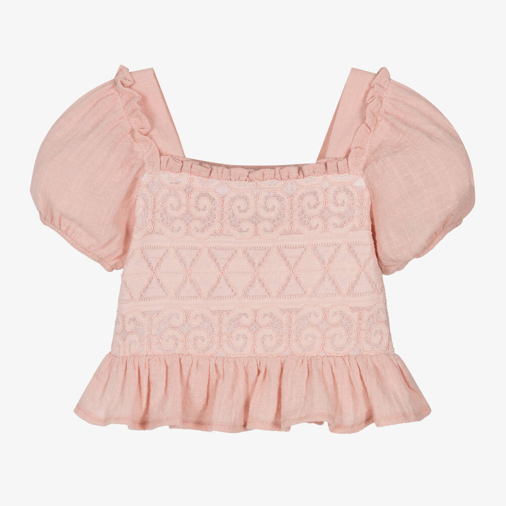 A lovely pink blouse for girls by Mayoral, made from a lightweight cotton blend. The front lace panel has a pretty embroidered design with a soft partial lining for added modesty. It has puffed short sleeves, an elegant square neckline, and a frilled trim on the hemline. The shirred elasticated back panel allows for a comfortable fit.