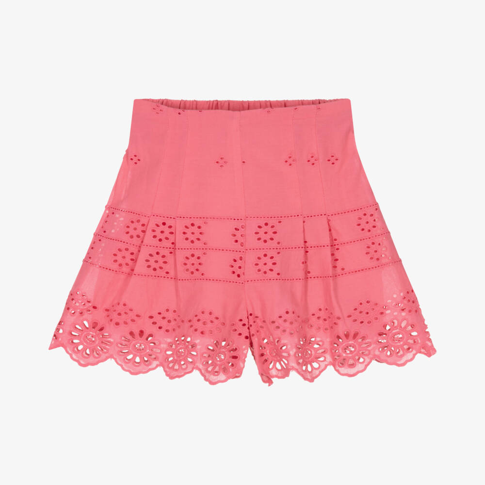 Pretty pink cotton shorts for girls by Mayoral, with lovely broderie anglaise detailing. Soft and lightweight, this easy-to-wear style is fully lined for comfort and the waist is gently elasticated around the back for easy pull-on.