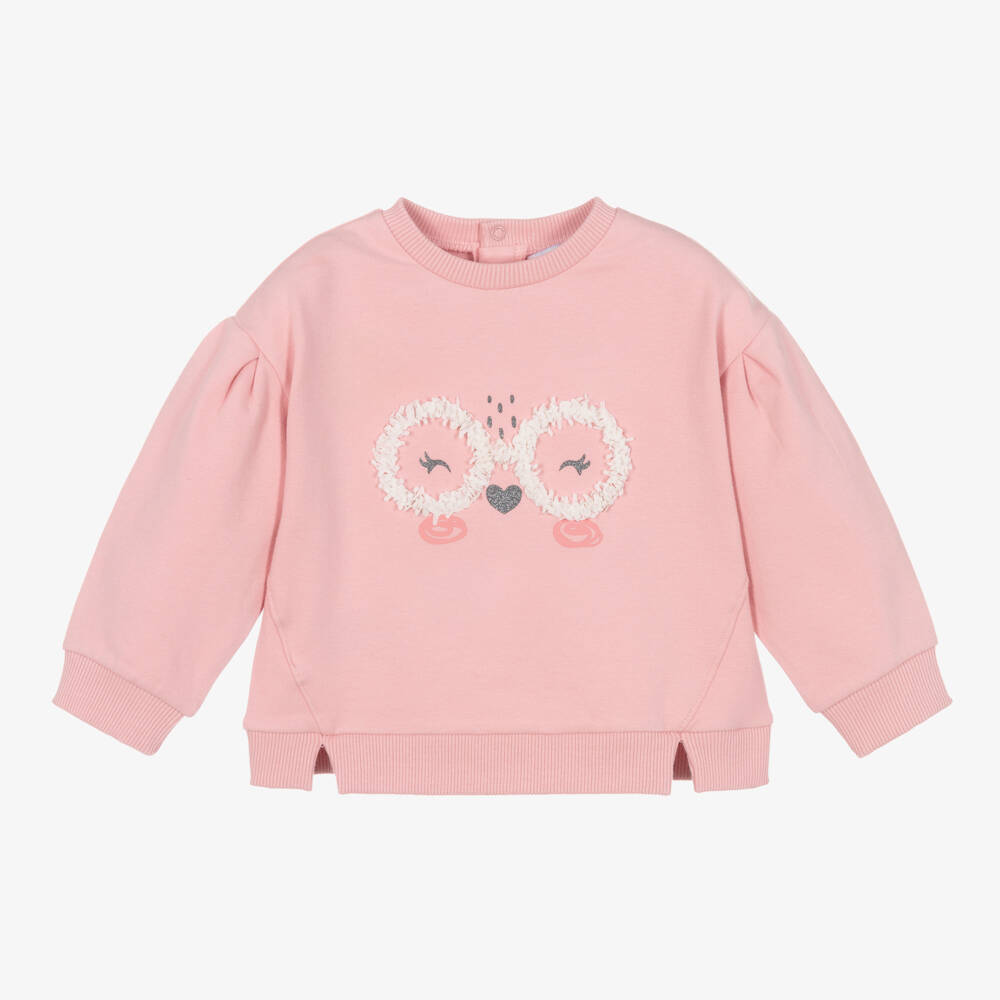 A pink boxy-fit sweatshirt for younger girls by Mayoral, made in mid-weight, sustainable cotton. Comfortable in soft and stretchy jersey, this cute top has dropped shoulders, ribbed cuffs and an adorable cat face design on the front, with glitter accents and fuzzy fabric glasses. It fastens with poppers on the back for simple, fuss-free dressing.