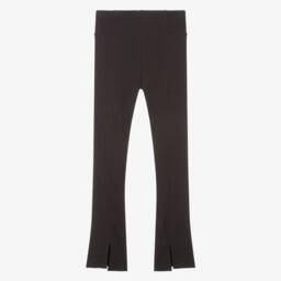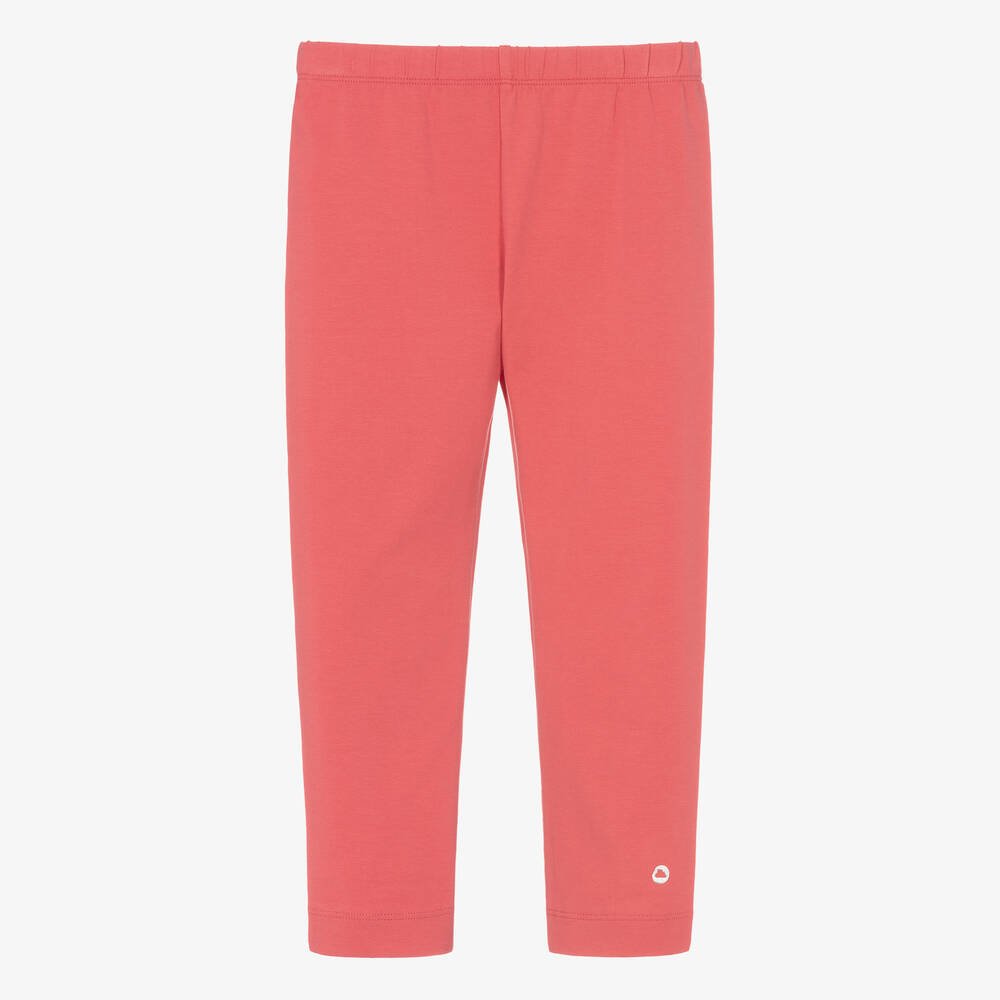 Dark coral pink cropped leggings for girls by Mayoral, made in soft and stretchy sustainable cotton jersey. They have a comfortable elasticated waistband and a silver logo printed on one leg.