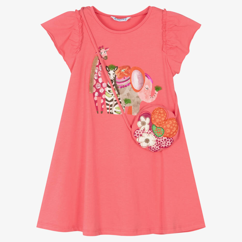 Girls pretty pink cotton dress and bag set by Mayoral, made in soft and comfortable jersey. Printed with a sweet jungle animal design, it has shiny sequin and button trims. The dress has short frill sleeves and slips on easily over the head for easy wear. The matching bag completes the look beautifully and fastens with a velcro patch.