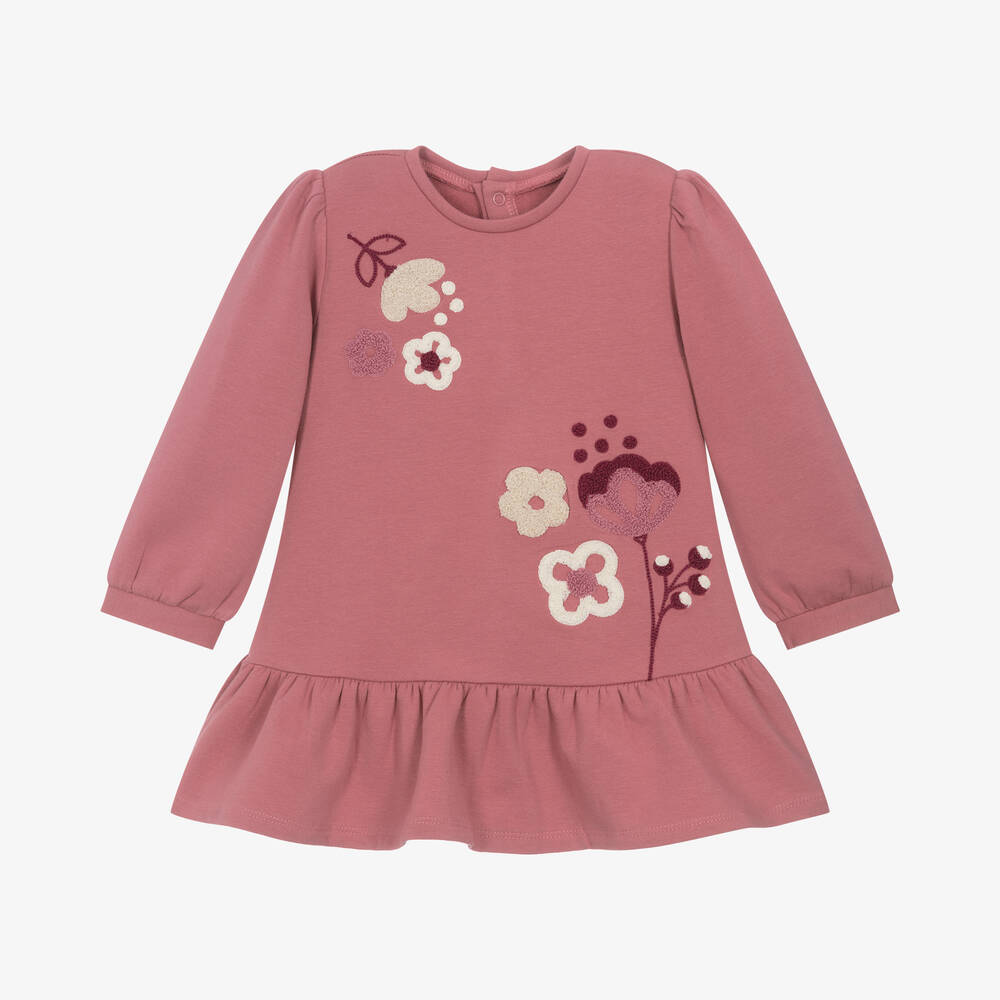 A lovely pink dress for little girls by Mayoral, with pretty flowers embroidered on the front. Made in soft cotton jersey with a cosy fleecy inside, it has gently puffed long sleeves and a sweet frilled hem. There are easy fastening poppers on the back to help with dressing.