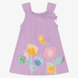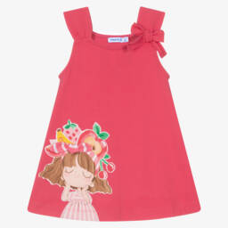 Little girls will look delightful in this fuchsia pink dress by Mayoral. Made in soft cotton jersey, this casual, sleeveless style features a colourful flower and girl design, with a playful 3D bow. Comfortable and easy wearing, it has a gentle A-line shape, with a sweet bow on one shoulder.