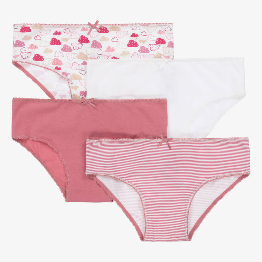 A four-pack of white and pink cotton knickers for girls by Mayoral, super soft against delicate skin. These jersey pants have plain, striped, and cloud patterns, with scalloped trims and a little bow on the front.
