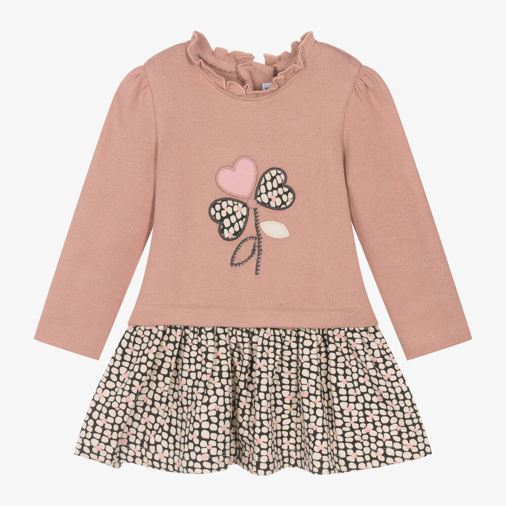 Lovely pink dress for little girls by Mayoral. Made in a soft cotton knit, the top half has long sleeves, a sweet ruffle collar and a lovely floral appliqué on the front with heart shaped petals. It has long sleeves and a concealed zip fastening on the front. The jersey skirt has an ivory spotted design on a dark grey background with cute pink hearts. It has a fleecy underside for a warm and cosy finish.