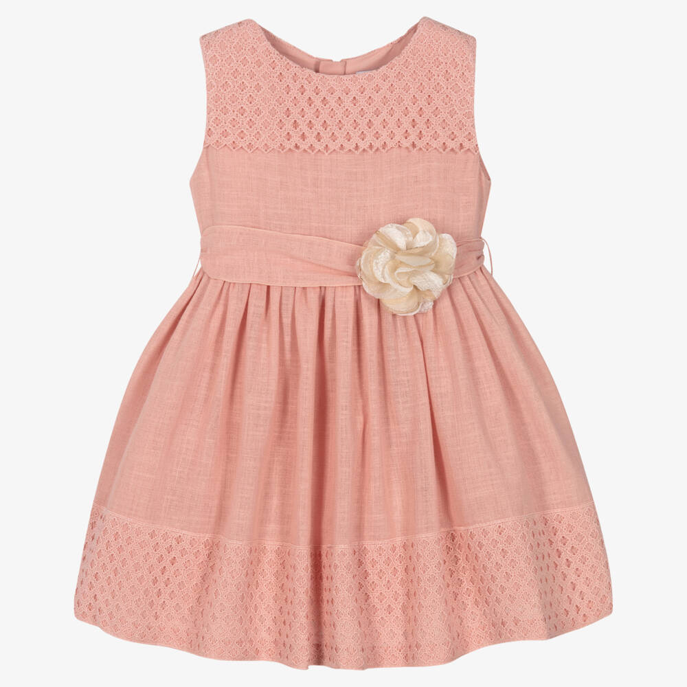 Elegant for special occasions, a blush pink dress for girls by Mayoral, with delicate guipure lace trims. Made and lined in a sheer and lightweight cotton blend, it has a netting trim around the lining for a beautifully shaped hemline. The removable sash, with a fixed gold and ivory fabric flower, gives it a lovely finishing touch.