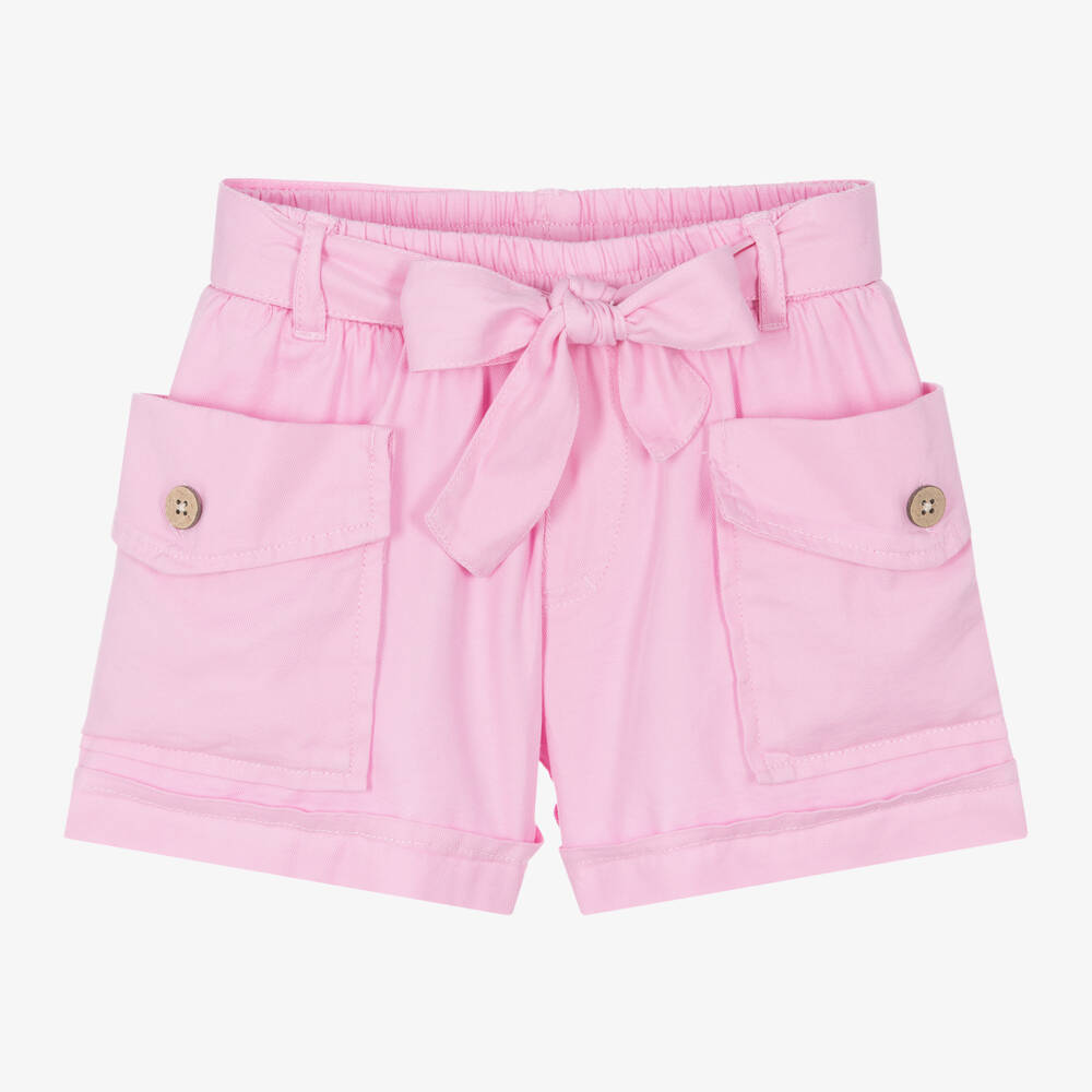 Stylish pink cargo shorts for girls by Mayoral. Comfortable and lightweight, they are made in soft cotton and lyocell blend. There is a slip pocket on each leg with a buttoned flap decoration, turned-up cuffs and a fixed belt to tie on the front. The waistband is elasticated for quick and practical pull on.