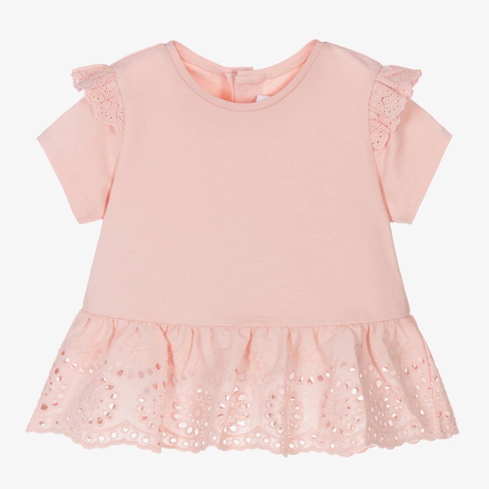 Pink T-shirt for little girls by Spanish brand Mayoral, made in the softest cotton jersey. Pretty and charming, it has broderie anglaise trims on the shoulders and hem. There are easy fastening poppers on the back.