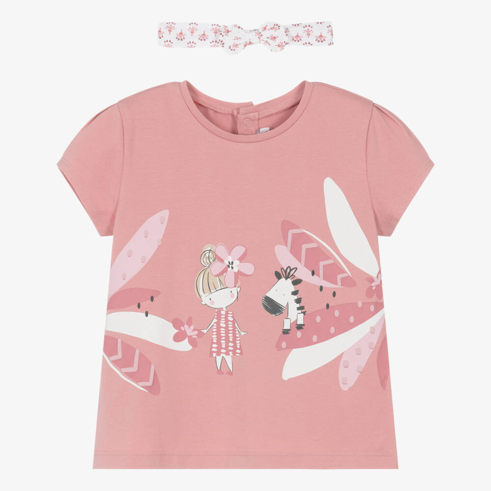 A lovely pink T-shirt and floral headband set for girls by Mayoral, made in soft cotton jersey. Fastened with poppers on the back, the T-shirt has sweet puffed sleeves and a girl and zebra graphic in shades of pink and white. The matching headband has an elasticated panel for comfort and is finished with a pretty bow.