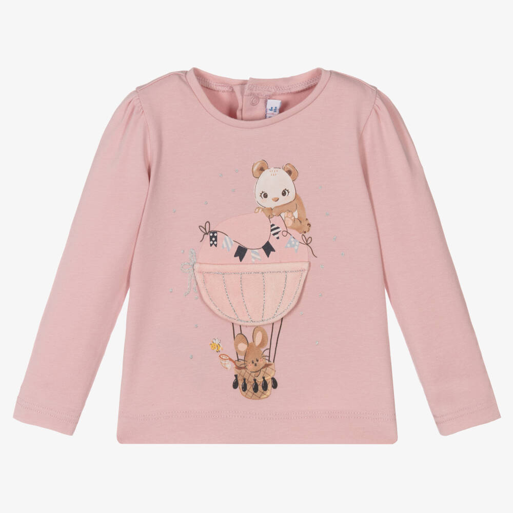 Pretty pink top for little girls by Mayoral, made in soft sustainable cotton jersey. It has an interactive pink hot air balloon appliqué, with sparkly silver trim and sweet brown bear and mouse prints. For easy dressing, it fastens with poppers on the back.