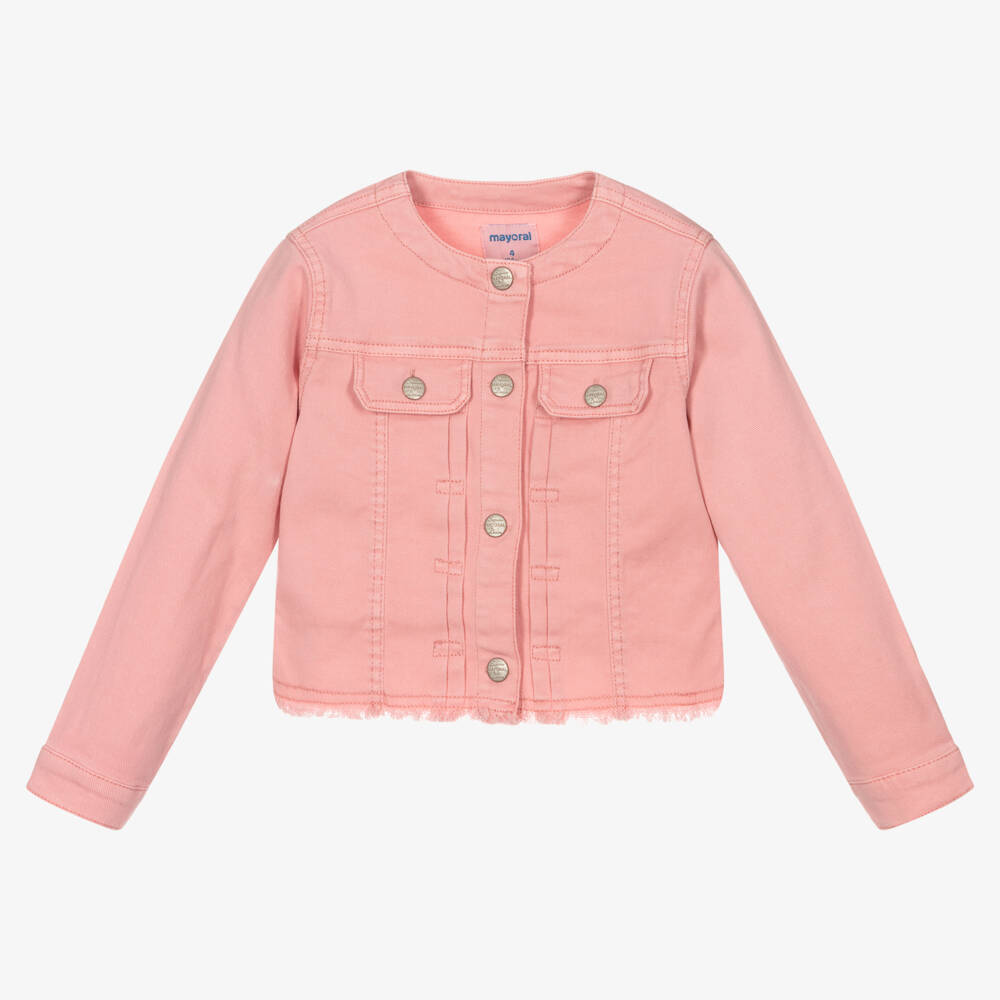 Pink denim jacket for girls by Mayoral, made in soft cotton with a little stretch. This collarless jacket has branded popper fastenings, faux front pockets and a frayed hem. There are smart pin tuck details on the back and near the front popper placket.
