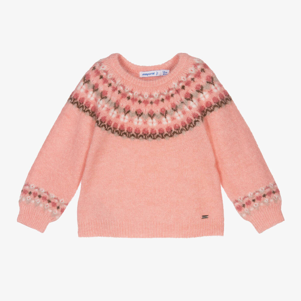Pink sweater for girls by Mayoral, knitted in a soft recycled polyester and acrylic blend. It has a sweet Fair Isle design in brown and grey.