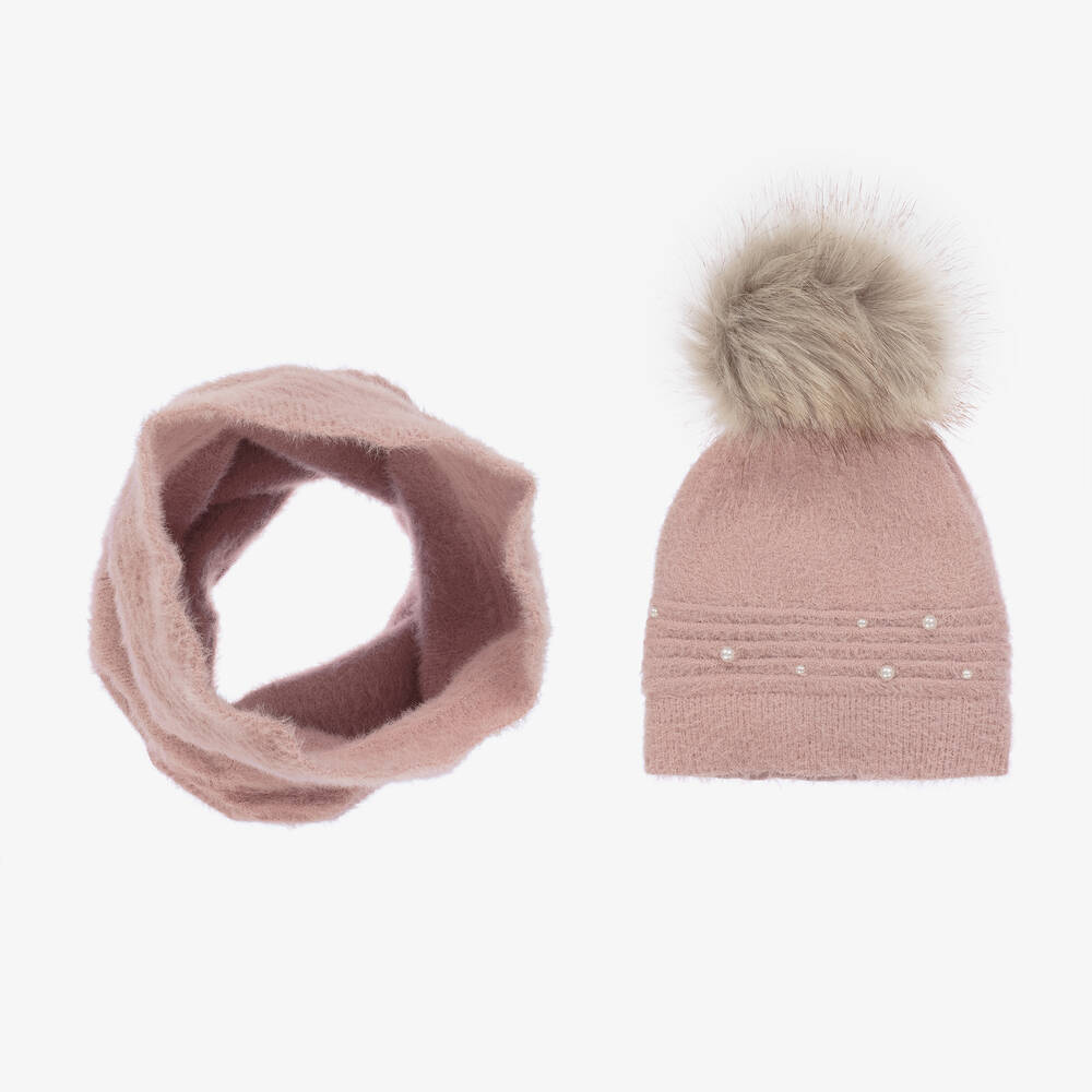 A dusky pink hat and snood set for girls by Mayoral, made in a soft and fluffy knit. The cosy snood has ribbed detailing and is great for wrapping up warm in the colder months. The matching hat has a faux fur pom-pom on the top and decorative faux pearls for a pretty finish.