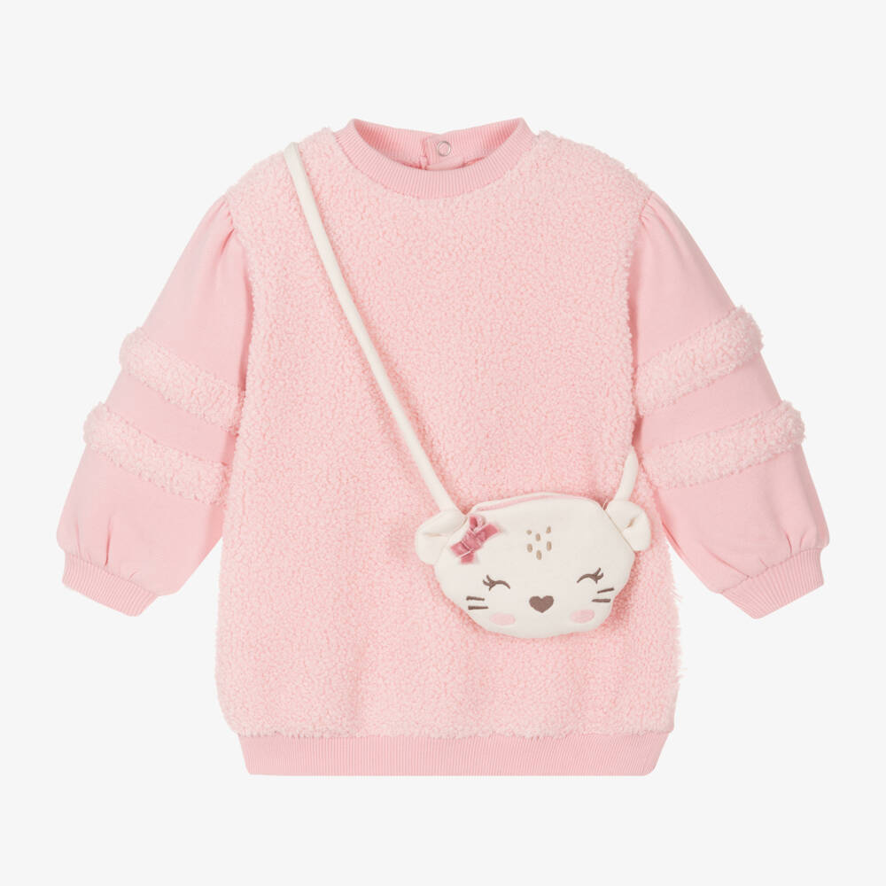 Younger girls pink sweatshirt dress from Mayoral. So soft and cosy, the front is made in fluffy bouclé fleece, with cotton-mix jersey on the sleeves and back. It fastens with easy-to-use poppers on the back for quick dressing. Included is a lovely ivory shoulder bag in the shape of a cat, with a pink velvet bow detail, an embroidered face and a popper fastening to close the bag.