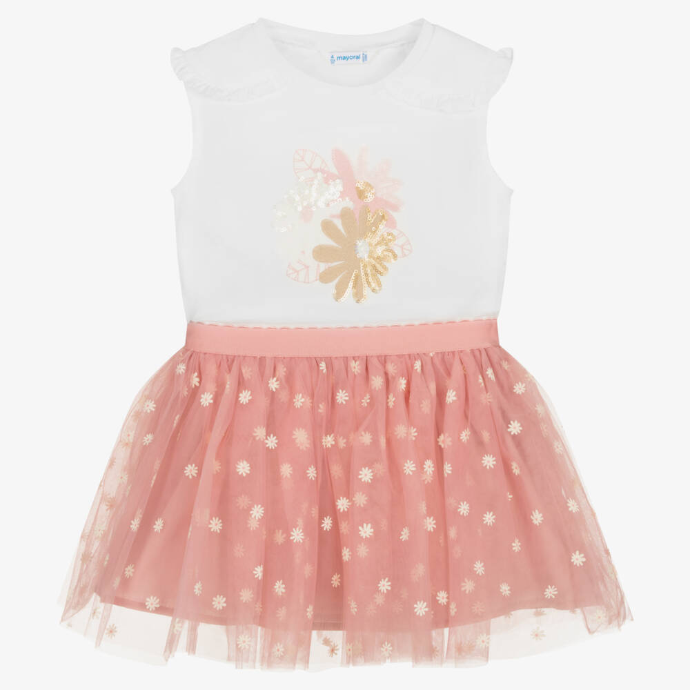 Beautiful white and dusky pink skirt set for girls by Spanish brand Mayoral. Made in soft cotton jersey, the sleeveless T-shirt has embroidered and sequin flowers on the front, with pretty ruffle trimmed shoulders. The tulle skirt has an all-over daisy print, a stretchy elasticated waistband and a comfortable voile lining.