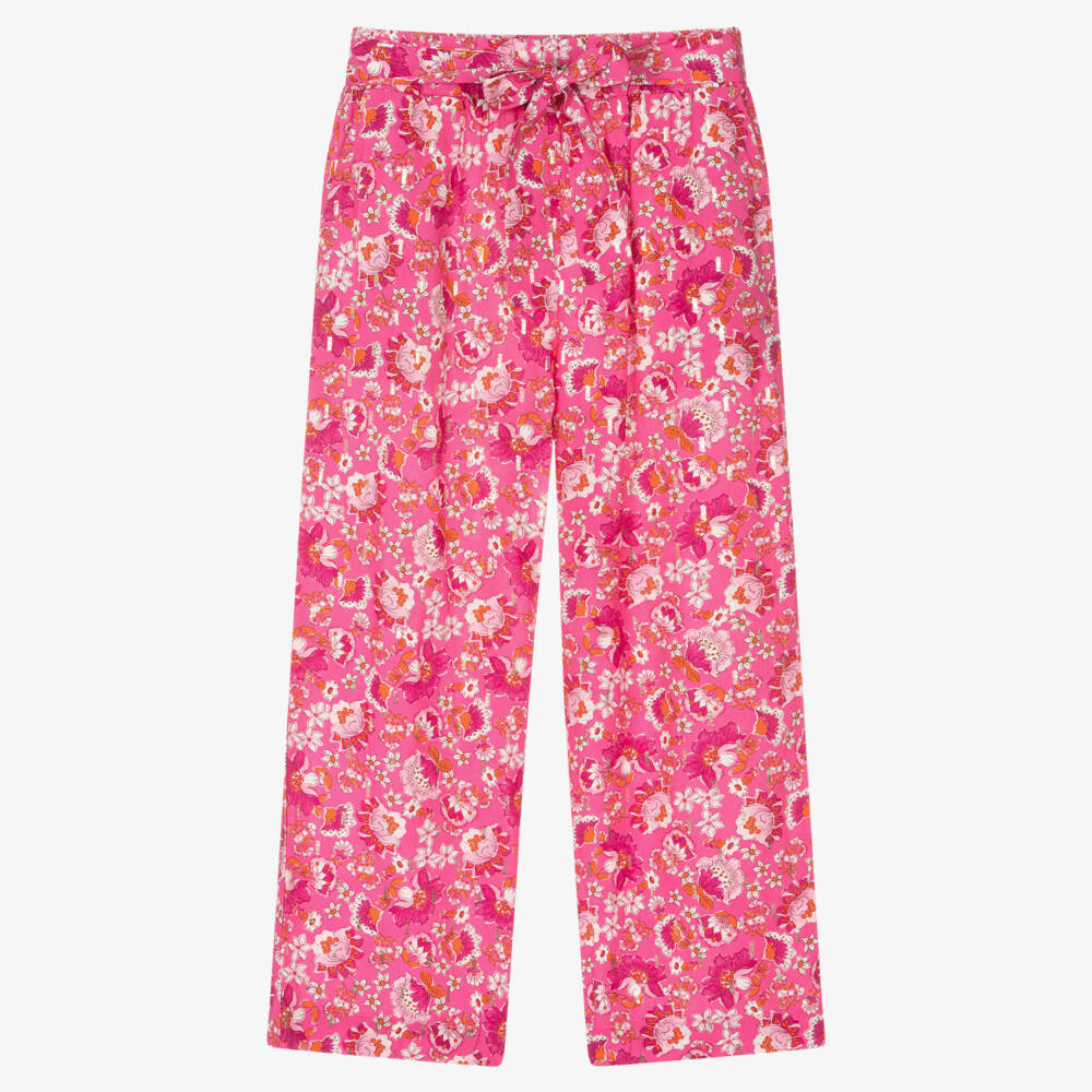 Beautiful pink floral wide leg trousers for girls by Mayoral, with shiny gold print for a touch of sparkle. Soft and lightweight, with a lovely drape, this comfortable and elegant style has an elasticated waistband with an attached sash tie and slanted front pockets.