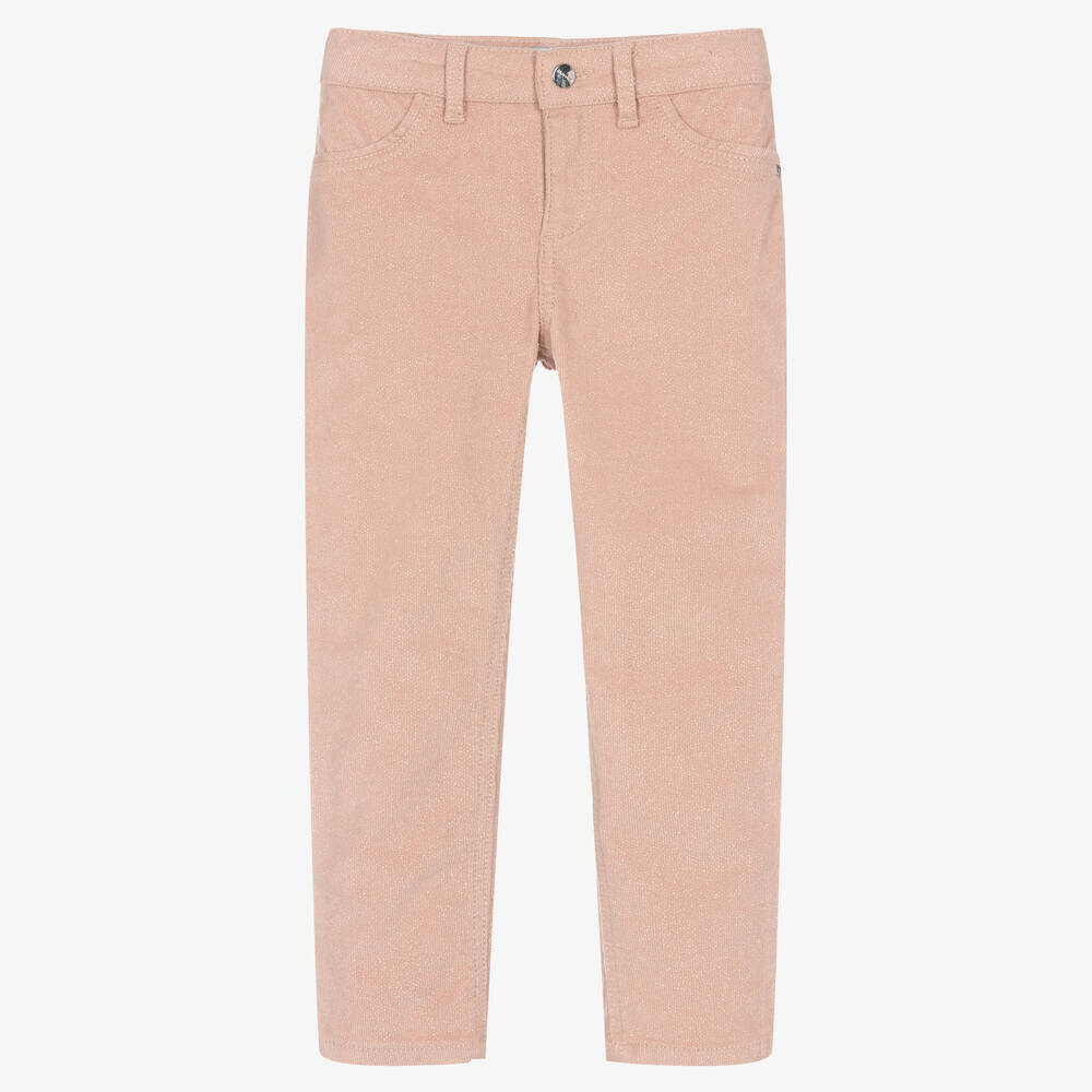 Dusky-pink cotton corduroy trousers for girls from Mayoral, in a skinny fit. Soft and comfortable, these sparkling trousers are designed with slight stretch for freer movement. They have faux front pockets, silver-tone heart-shaped rivets, and embroidered heart details on the back pockets. The waist is detailed with a logo patch and adjustable with inner buttons for the ideal fit.