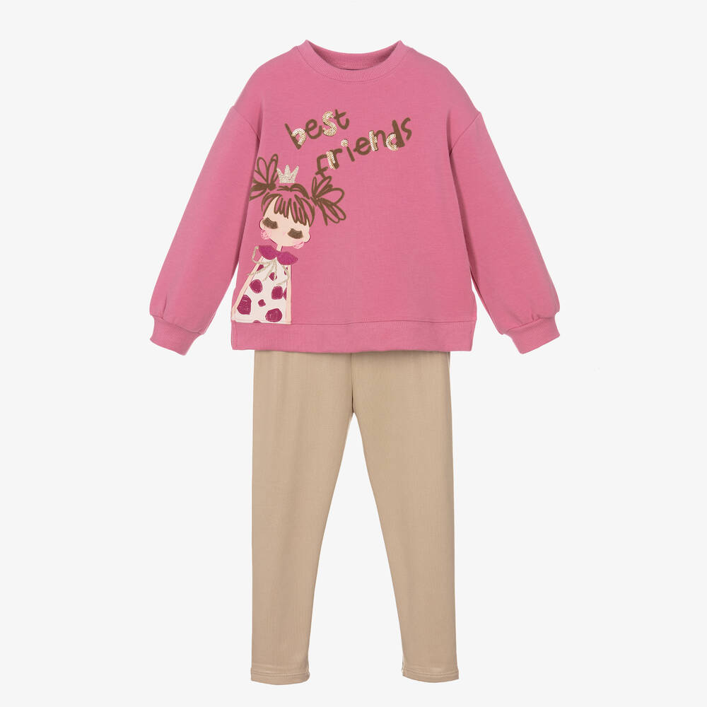 Cool and comfortable pink leggings set for girls by Mayoral. The super soft cotton jersey sweatshirt has a fun logo and slogan embellished with gold glitter and sequins to match the sparkly leggings for a coordinated look.