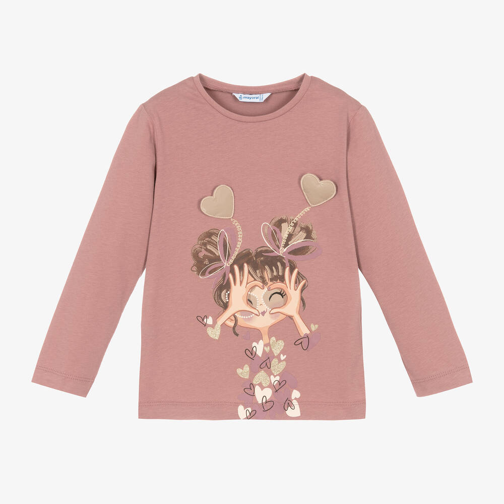 Dusky pink top for girls by Mayoral, made in soft cotton jersey. This long-sleeved style has a fun girl graphic on the front with beige heart appliqués. Glittery detailing within the print adds a touch of sparkle to this casual piece.