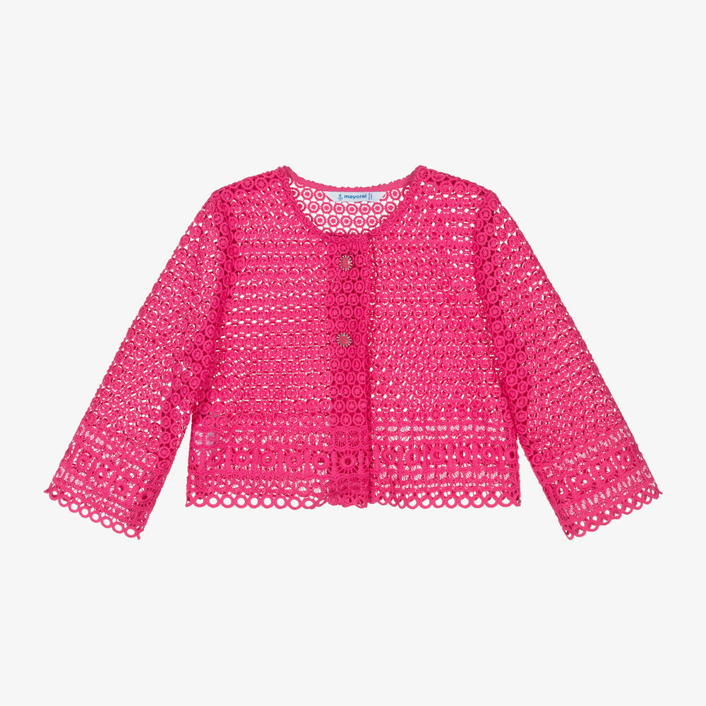 A fuchsia pink cardigan for girls by Mayoral, detailed in gorgeous guipure lace. Beautiful for layering, this long-sleeved top fastens with concealed poppers and has sparkly faux diamanté buttons decorated on the front.