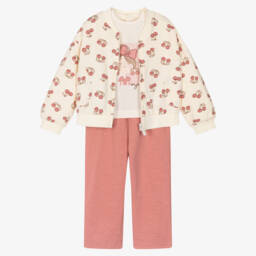 This charming ivory and pink trouser set for little girls by Mayoral features a playful combination of colours and patterns. The short-sleeved top has a fun girl graphic on the front and popper fastenings on the back. The brightly coloured trousers have a comfortable elasticated waist and faux pockets. Completing the look is a zip-up top, with cosy ribbed trims and patch pockets, patterned with cherries.