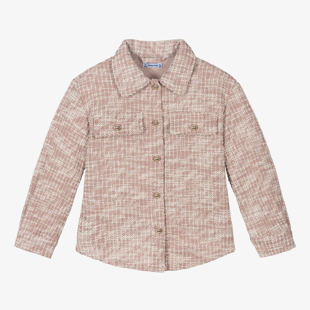 Pink and ivory tweed effect shirt for girls by Mayoral. It is made in a mid-weight, cotton blend jersey with glittery threads for added sparkle. Casual but stylish, it has long sleeves and faux pockets on the chest. Ideal for layering, it has gold button fastenings on the front and cuffs.