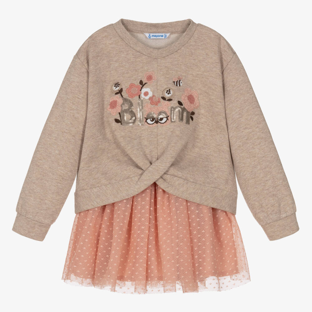 Sweet on casual days, this beige and pink skirt set for girls is by Mayoral. The soft jersey sweatshirt has glittery gold specks, with a sequined 'Bloom' design on the front. It has a stylish wrap-around effect for added shape. The tulle plumeti skirt has an elasticated waistband and a lightweight lining for comfort.