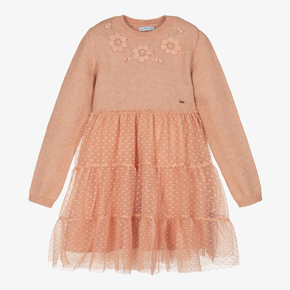 Lovely pink dress for girls by Mayoral. The bodice is made in a soft chunky knit with a sparkling gold thread running through. Warm and cosy it has pretty floral knit detailing on the chest and a gold metal charm on the waist. For a touch of elegance, the skirt is made in layers of soft and sparkling tulle, lined in a soft cotton jersey for comfort. This product contains recycled fibres.