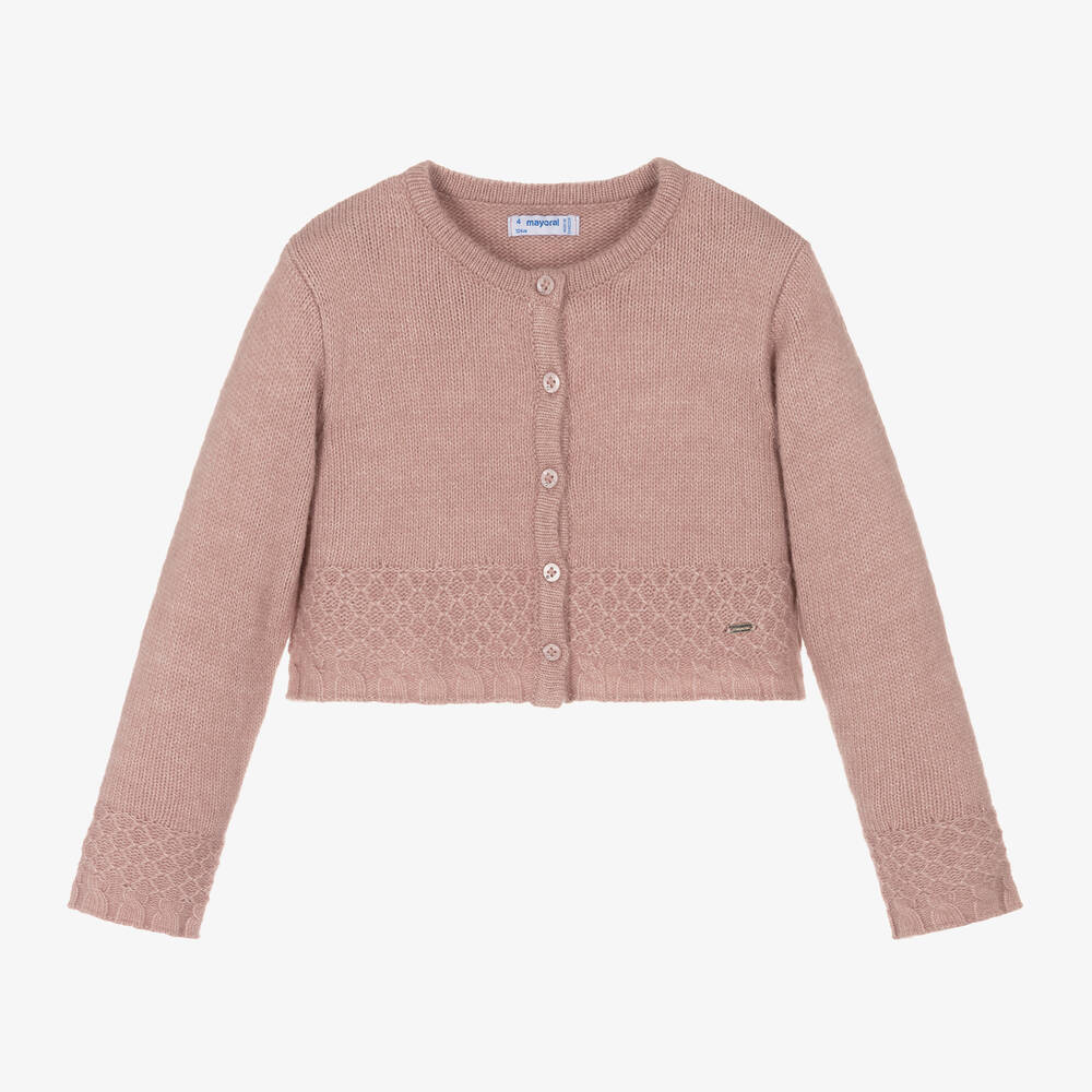 Dusky pink cardigan for girls by Mayoral, with a pretty pattern around the hem and cuffs. Lovely for layering when the weather turns chilly, it is knitted in a beautifully soft wool blend and is designed to sit neatly on the waist. There are pearlescent diamanté button fastenings on the front, with a branded metal plate near the hem.