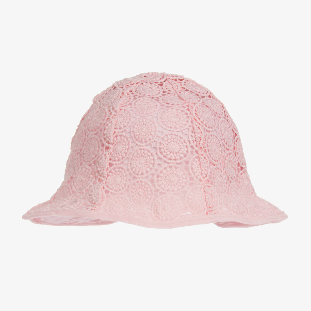 Pretty pink sun hat for little girls by Mayoral, made in soft, delicate embroidered lace. It has a lightweight cotton lining for comfort with a grosgrain ribbon bow and gold metal heart shaped charm. The hat is gently elasticated at the back for a comfortable fit.