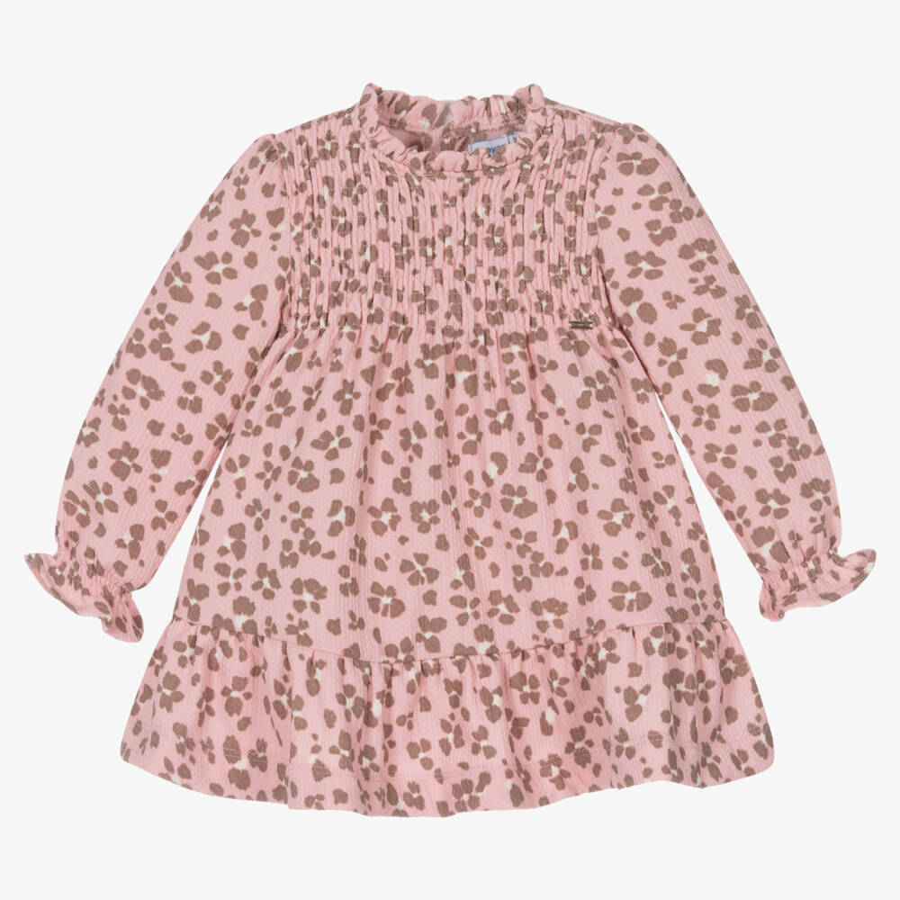 Pretty pink dress for little girls by Mayoral, made in soft jersey with a fleecy inside. Patterned with an animal-inspired floral print, this comfortable dress has a shirred panel on the chest to create a better fit. A small gold tile embossed with the brand's name on the front gives a subtle designer touch. To allow for quick and easy dressing, it has a concealed zip fastening on the back.