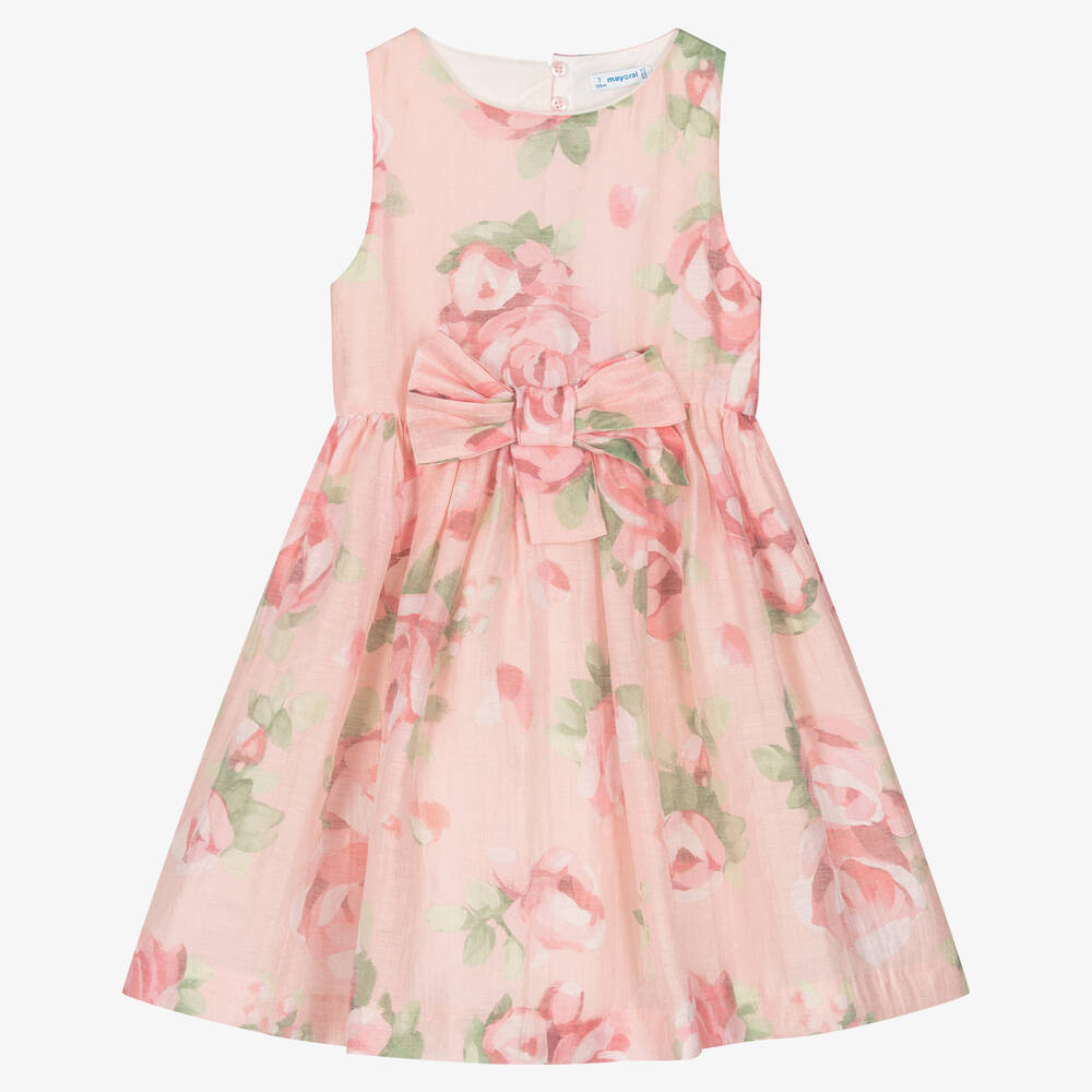 Girls pink floral dress by Mayoral, made from a beautifully soft and lightweight linen blend. Printed with a gorgeous roses design, this sleeveless dress has a smooth lining with net trims for added volume. There is a large fixed bow on the front and the back has an elegant open shape, with a small zip and button closure.