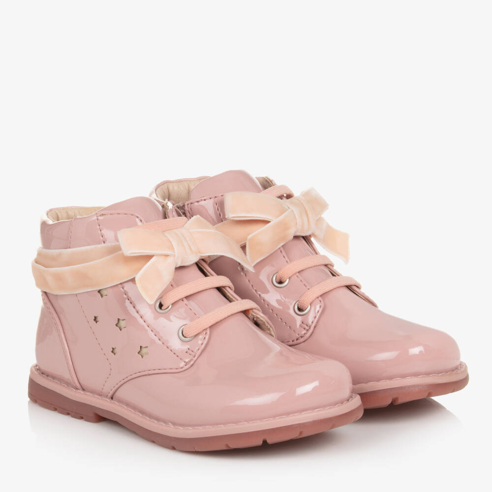Lovely pink ankle boots for younger girls by Mayoral, made in glossy faux patent leather. They have a sweet pale pink velvet bow and ribbon trim around the ankle and little cut-out stars on one side. They are part fabric and leather lined, with a lightly padded leather insole for optimum comfort and a pink non-lip rubber sole for improved grip. The elasticated laces and the side zip fastenings allow quick and easy slip-on.