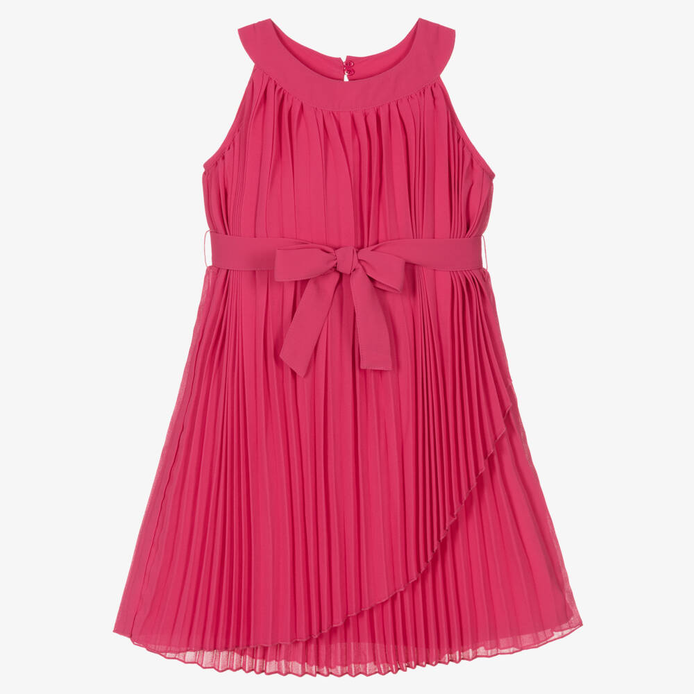 Fuchsia pink dress for girls by Mayoral, made from soft and lightweight chiffon. Designed with pretty pleats, it has a rounded neckline and button fastenings on the inside of the neck. Fully lined for comfort, it comes with a detachable belt on the waist that can be tied at the front or back for a simple finishing touch.