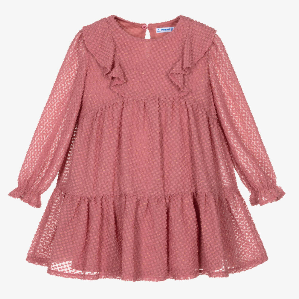 Pretty pink dress for girls by Mayoral, made in soft and delicate plumeti chiffon. It is woven with a shimmery gold thread and has ruffle-trimmed shoulders. The sleeves are sheer with elasticated frilly cuffs, and the dress has an elegant keyhole button fastening on the back. There is a soft and stretchy lining for comfortable wear.