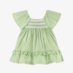 A lovely pink dress for little girls by Mayoral, made in lightweight plumeti cotton. This sweet summer style has a gently smocked bodice with ric rac trims, a ruffled hemline and pretty flutter sleeves. It is lined for comfort and fastens neatly with buttons on the back.