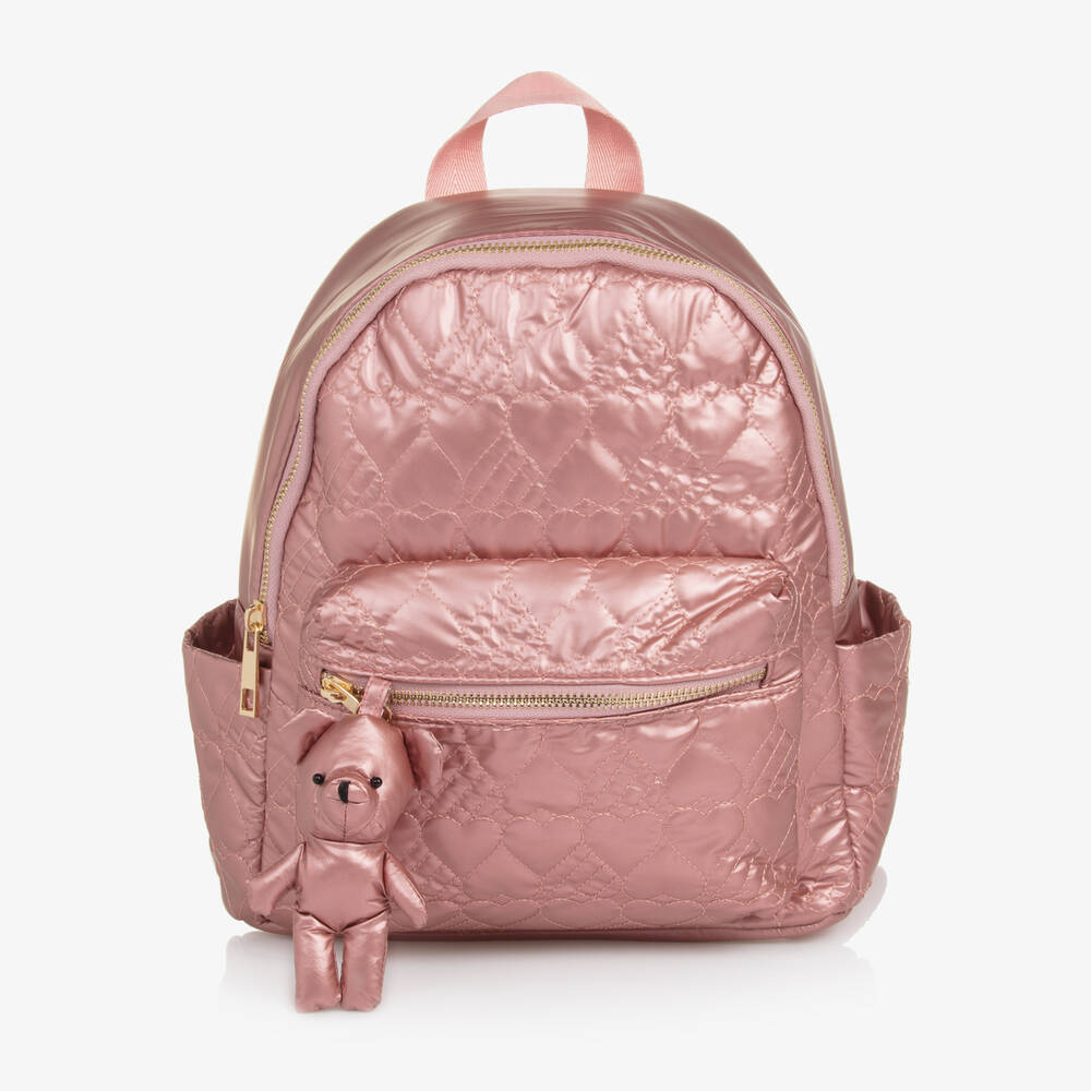 A metallic pink backpack for girls by Mayoral, ideal for carrying smaller essentials. It is made in soft faux leather, with a fun heart-shape quilted pattern. There is a zip fastening main compartment and two side pouches. The smaller zipped pocket on the front is finished with a 3D bear. The padded shoulder straps are adjustable for an ideal fit, and there is a useful carry handle on the top.