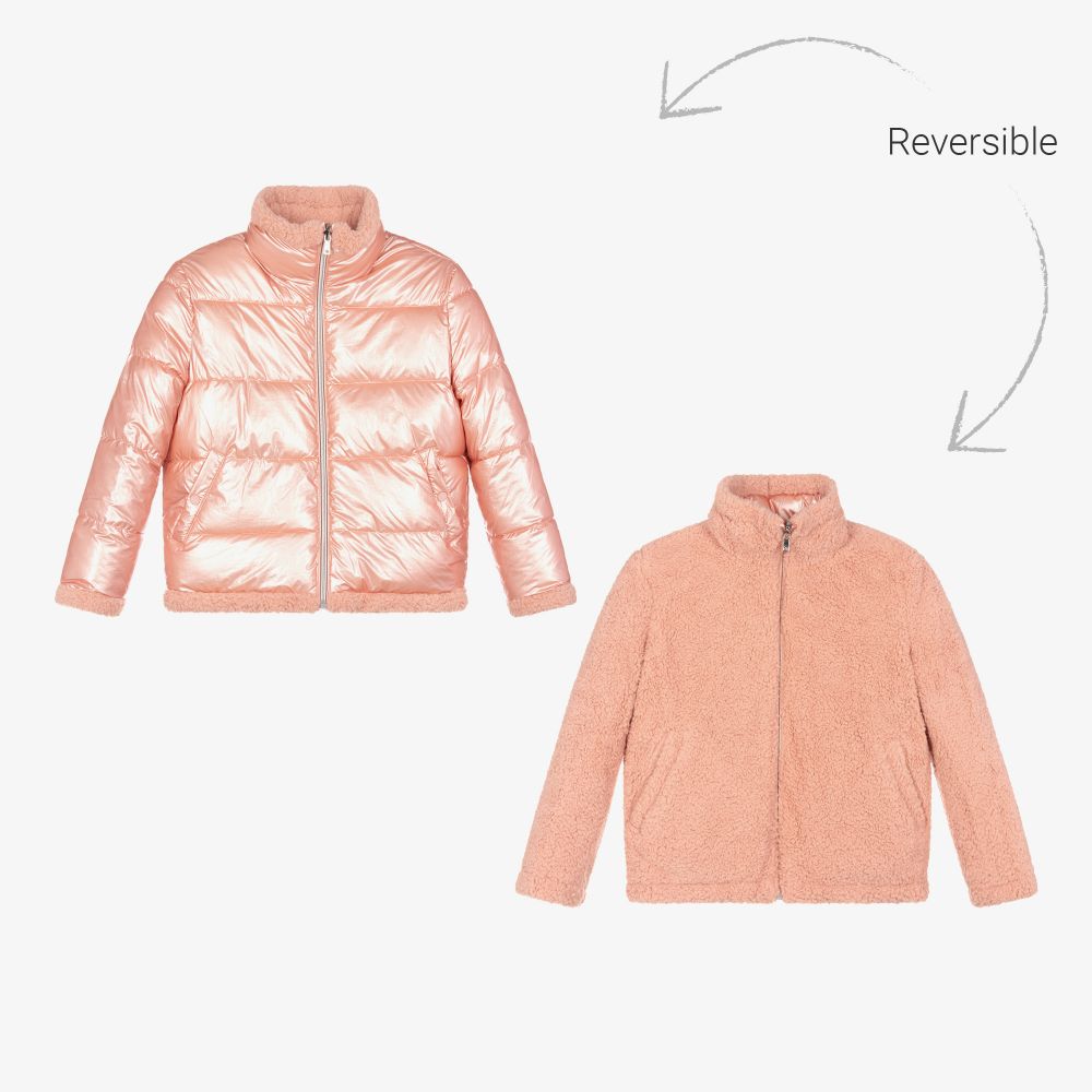 Girls pink reversible puffer jacket from Mayoral, with a lovely sheen. The pink side is made in silky-smooth nylon and the reverse side is in soft pink sherpa fleece. Both sides have front pockets and it fastens with a zip on the front.