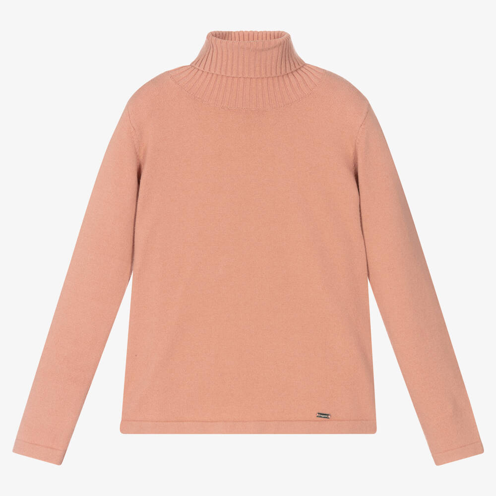 Blush pink roll neck top for girls by Mayoral, knitted in a soft cotton blend. It has ribbed trims and has the brand's silver logo tab by the hemline. This garment contains sustainable cotton.