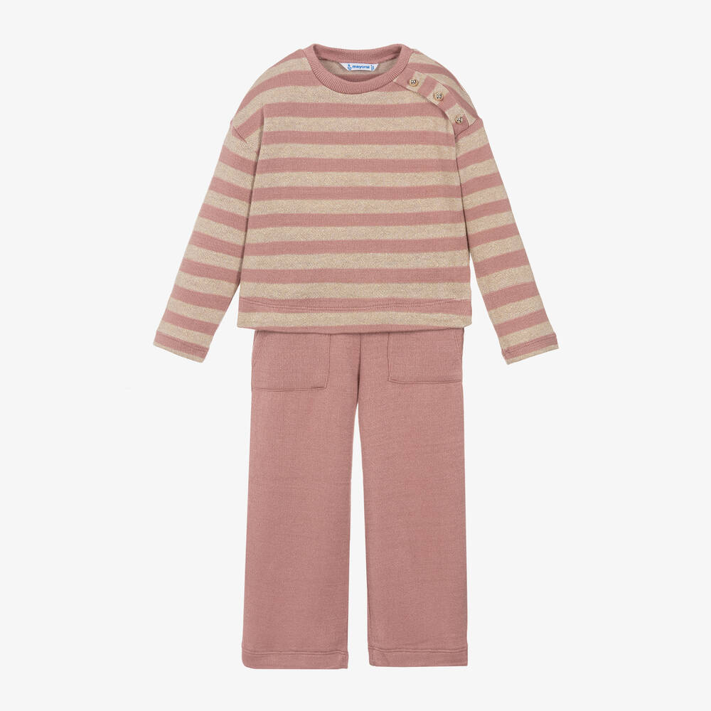 Effortlessly chic, pink trouser set for girls by Mayoral, made from a soft and stretchy viscose blend with shimmery gold in the knit. The ivory and pink striped top has long sleeves and decorative golden dome buttons on one of the dropped shoulders. The wide-leg trousers have two patch pockets and a faux drawstring on the elasticated waist for a laid-back look.