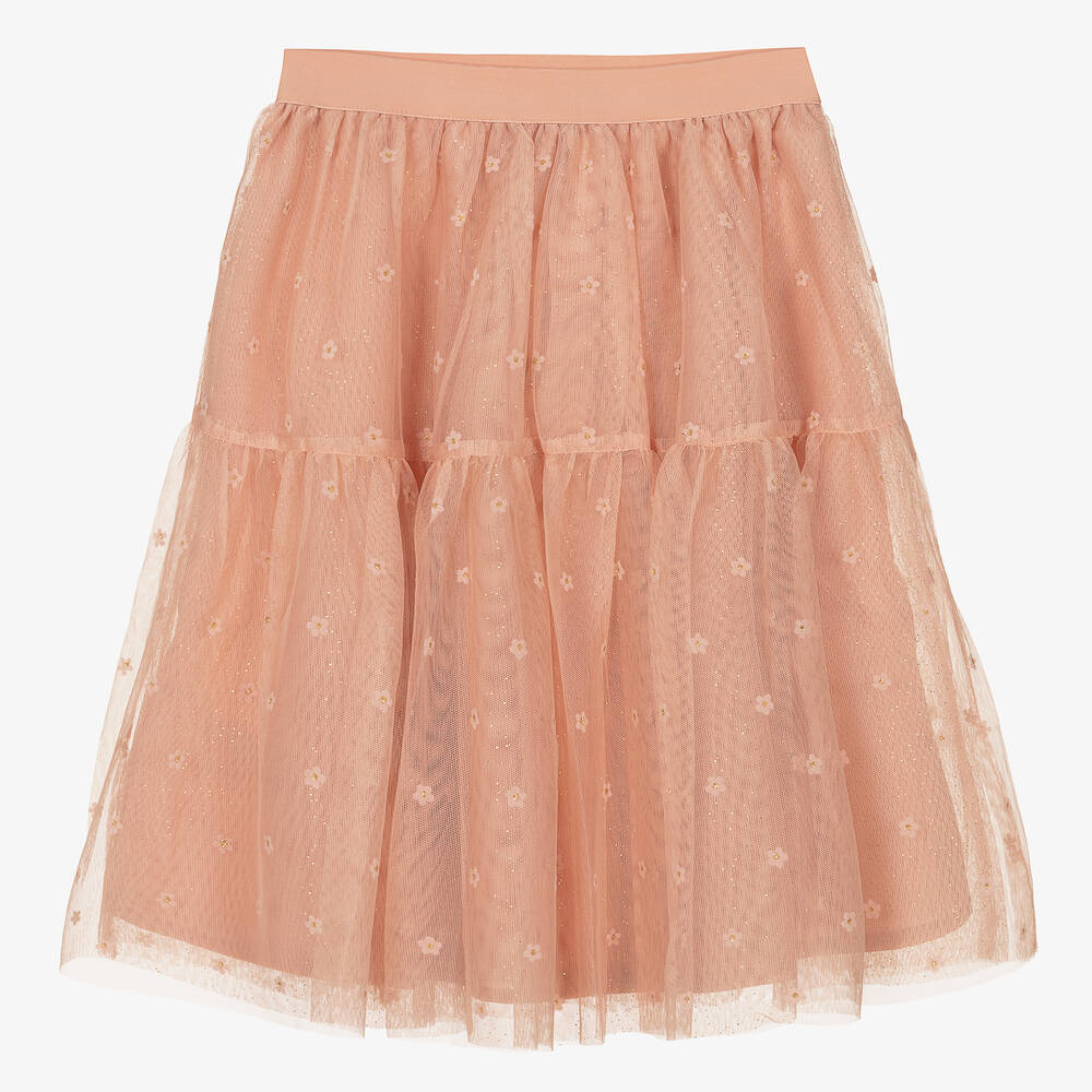 Lovely for a special occasion, this pink tulle skirt for girls is by Mayoral. It is decorated with sparkly flocked flowers and has an elasticated waistband. There is a glittery gold tulle underskirt and a lightweight lining for comfort.