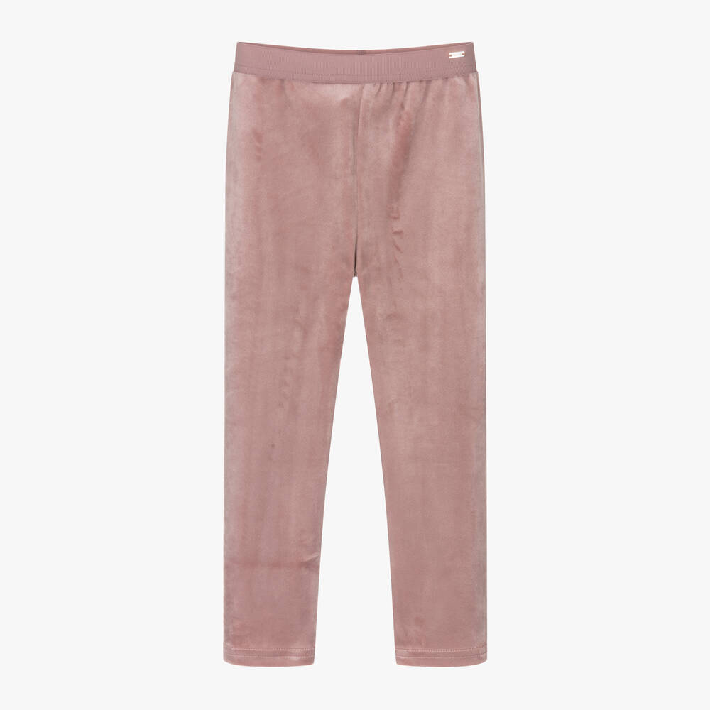 Dusky pink leggings for girls by Mayoral, made in beautifully soft and stretchy velour. Comfortable and easy to wear, they have a stretchy waistband trimmed with a gold logo tab for a discreet branded touch.