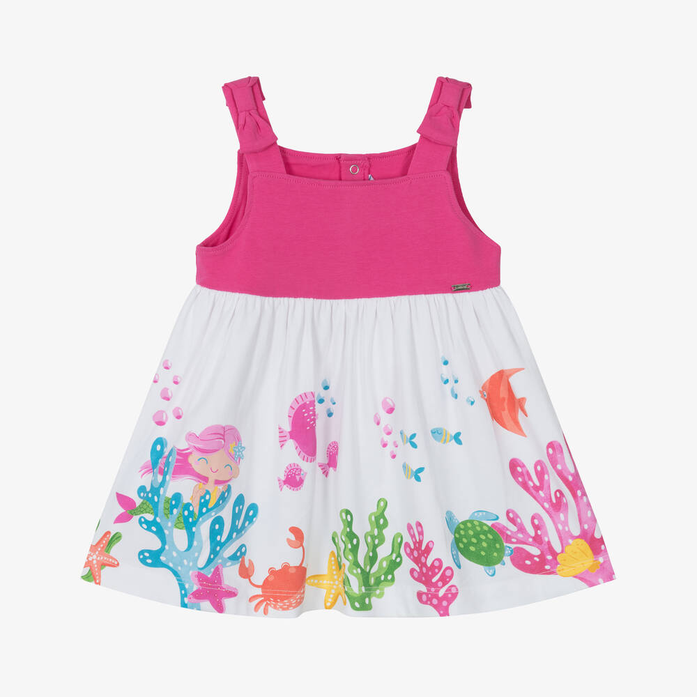 Both comfortable and cute, this summery cotton jersey dress for little girls is by Mayoral. The fuchsia pink bodice has sweet, fixed bows on the shoulder straps, whilst the white skirt has a colourful mermaid print.