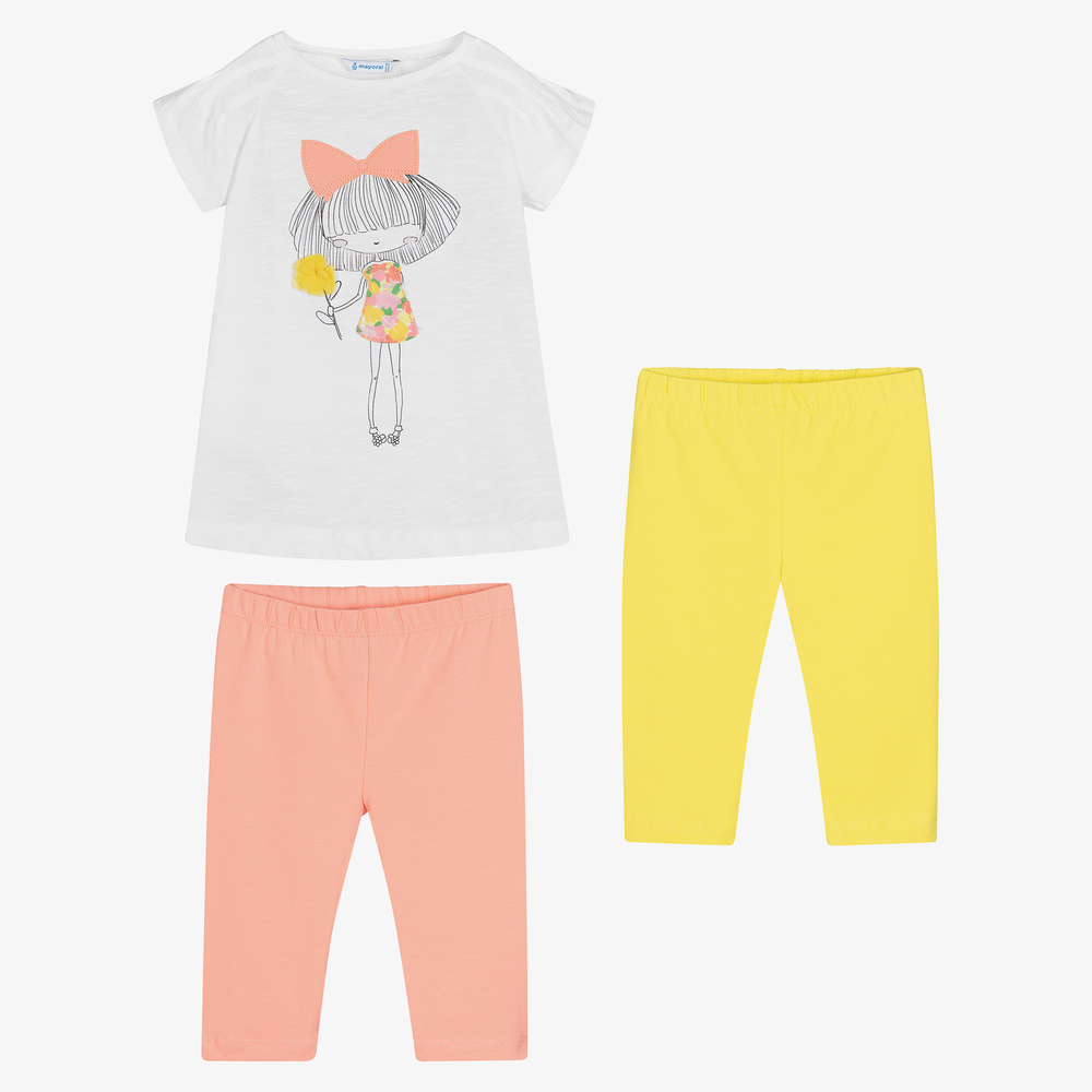 Three-piece sustainable cotton T-shirt and leggings set for girls by Mayoral, in white, peach pink and yellow. Soft and stretchy, the white T-shirt has a sweet little girl print with appliqué details in pink, yellow and green. Both pairs of cropped leggings have a comfortable stretchy waist.