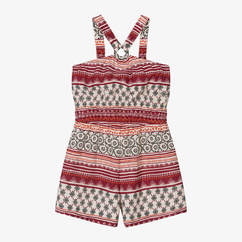 For older girls, this playsuit from Mayoral has an ivory background with a deep red and black abstract design. Made in a beautifully lightweight fabric, both the top and waist are elasticated for a comfortable fit. The shoulder straps have poppers on the back which fasten around a wood effect ring for a contemporary finish.