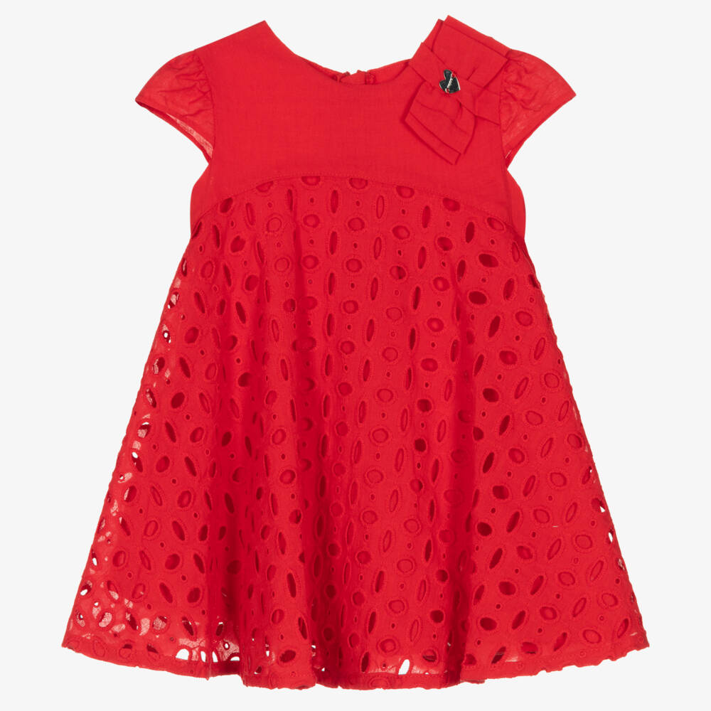 Red dress for little girls by Spanish brand Mayoral, made in soft cotton broderie anglaise. In a sweet A-line shape, it has capped sleeves and a cute bow detail on the chest. Fastening with a zip on the back, it is fully lined for comfort and finished with a rose gold, heart-shaped logo disc for a branded touch.