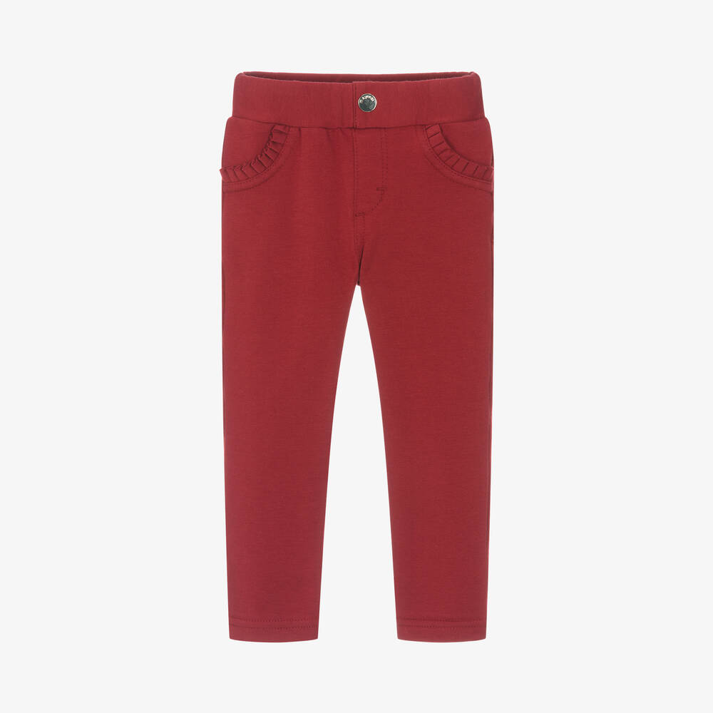 Red trousers for little girls by Mayoral, made in soft cotton jersey with stretch for comfort. Easy to wear, they have faux front pockets with ruffle detailing, a decorative gold button and floral stitching on the rear pockets for a sweet finish.