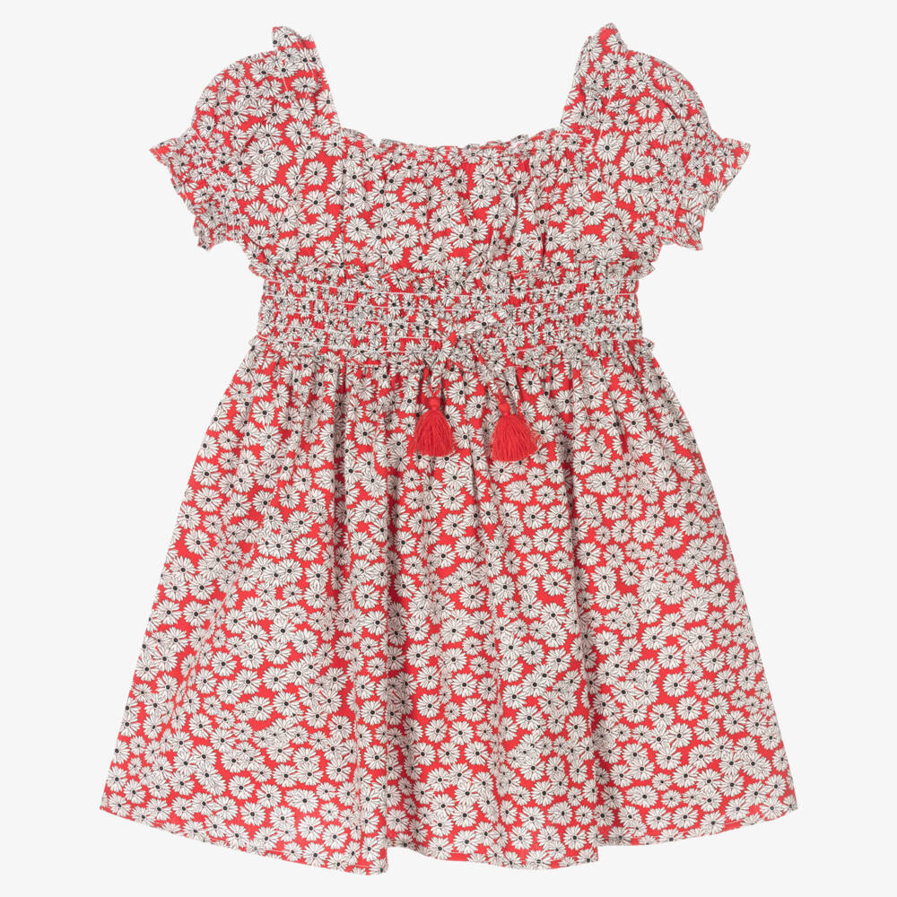 Gorgeous red floral dress for girls by Spanish brand Mayoral, made from the softest sustainable cotton poplin. Lightweight and breathable, it has an elasticated square neckline, pretty puffed sleeves, and a stretchy shirred waistband with a decorative bow.