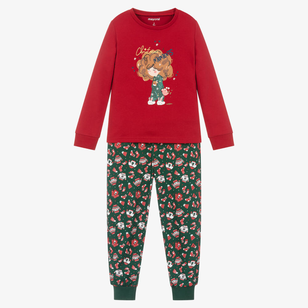Red and green cotton pyjamas for girls by Mayoral, made from super soft and stretchy jersey. The long-sleeved T-shirt has a festive girl printed on the front, with 'Christmas Moments' printed above. The trousers have an elasticated waist and cosy cuffs, with a festive sweater, sock, and hat pattern.